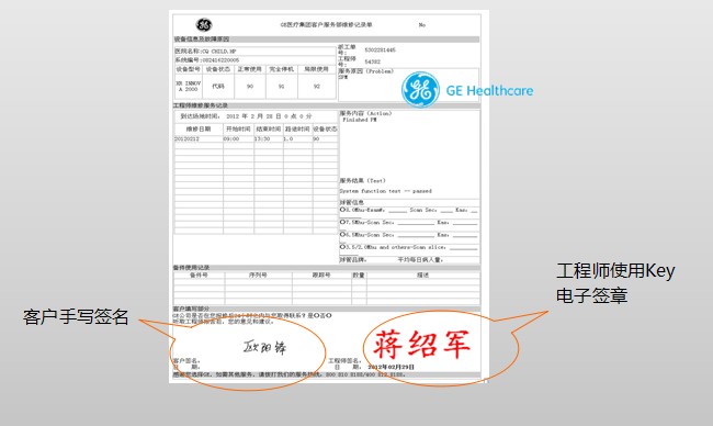 GE医疗集团隶属于GE(通用电气)公司,其客户服务部为众多医院客户提供大型医疗设备售后维护服务。维修后,客户填写签署维修派工单,并快递送交集团总部。由此带来了:耗材成本和快递成本巨大、派工单无法及时统计管理等问题。