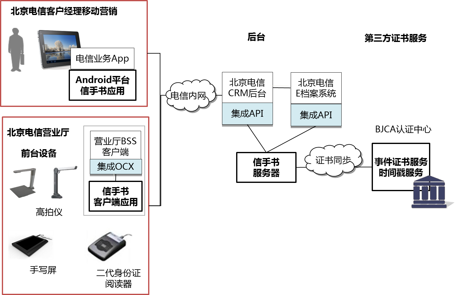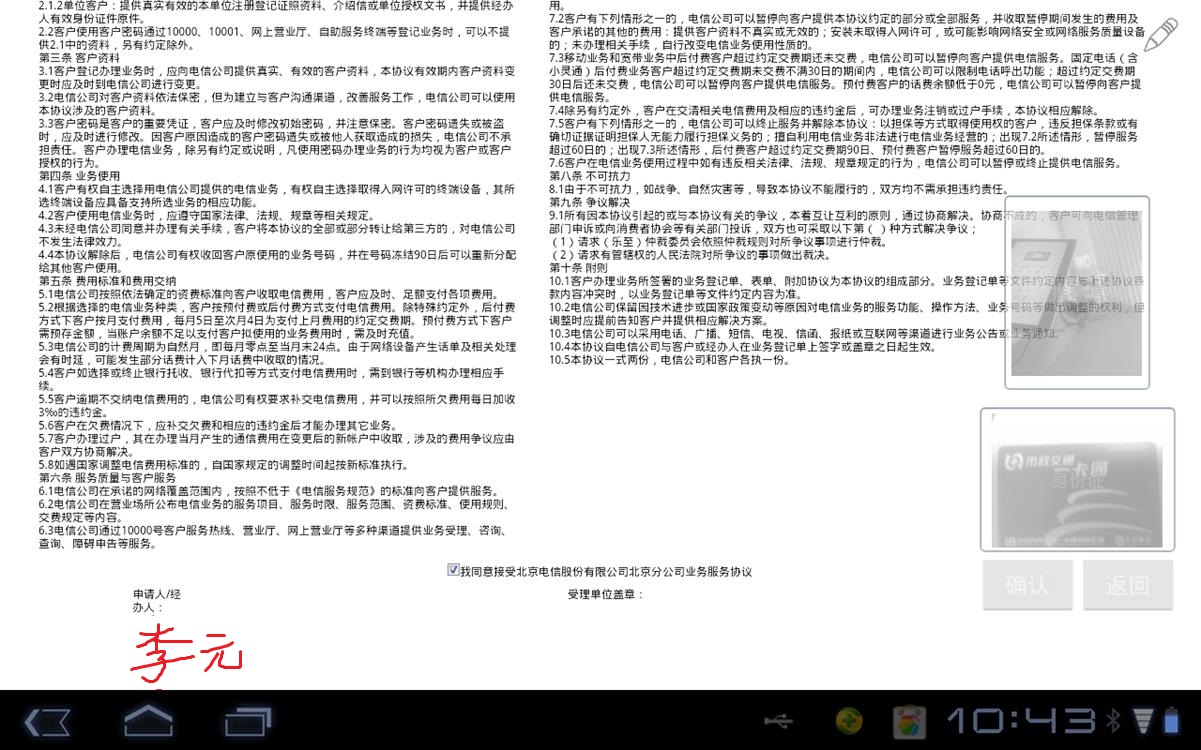 传统的电信业务办理采用纸张受理业务的服务模式,给营业厅带来了巨大的纸质耗材成本、管理成本。同时纸质业务办理过程繁琐,保存、查阅不便。北京电信迫切希望通过提升信息化水平,进行营业厅业务受理无纸化业务模式改造。BJCA基于信手书产品,为北京电信设实现了营业厅工单全无纸化的项目改造。顾客办理业务时,基于前端电子设备,以及无纸化工单系统,采用手写数字签名方式,实现了工单业务无纸化。该项目助力北京电信营业厅工单业务流程全面优化、服务水平提升、成本节约、绿色环保。针对客户经理上门业务营销移动化、在线化、无纸化的新需求,BJCA为其提供了移动营销手写数字签名解决方案。